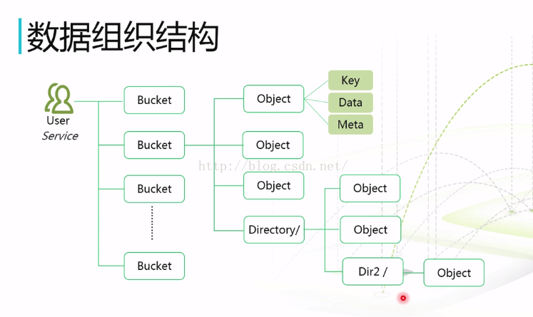 - service:提供给用户的虚拟存储空间,可以在这个空间中存储多个bucket
