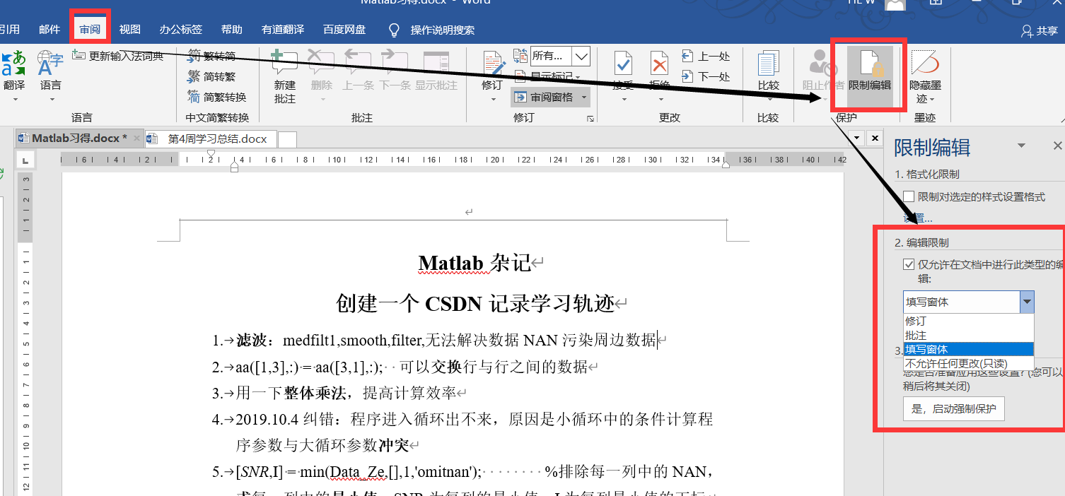 4.“审阅”—>“限制编辑”,可以使用户只能编辑设定的区域。