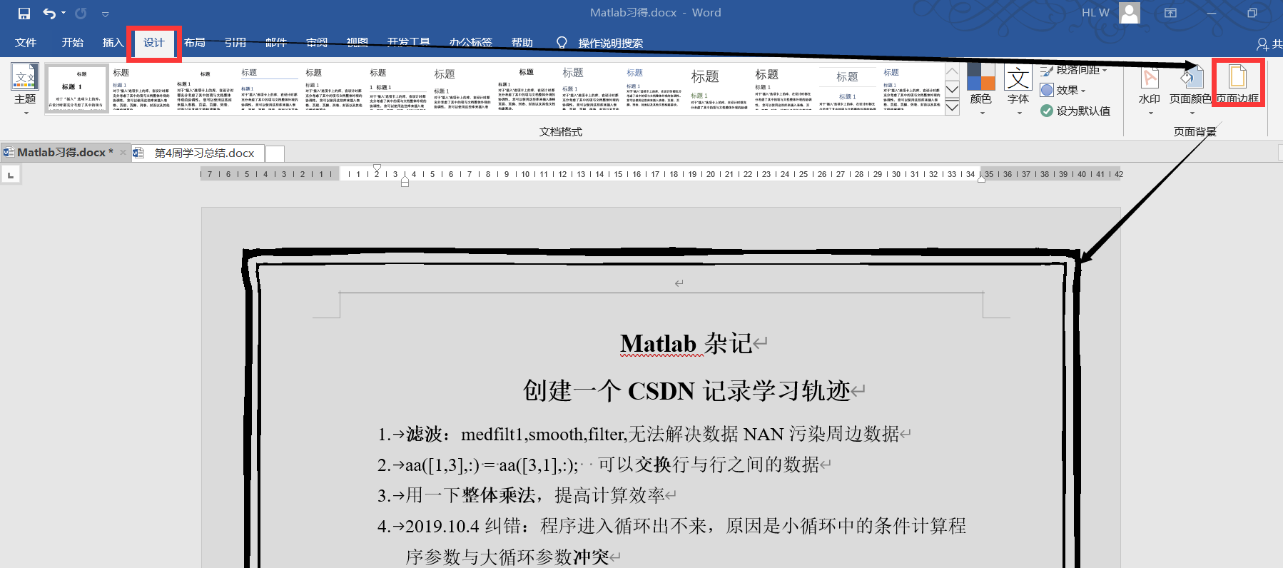 在”设计“一栏可以设计页面的颜色和页面的边框。