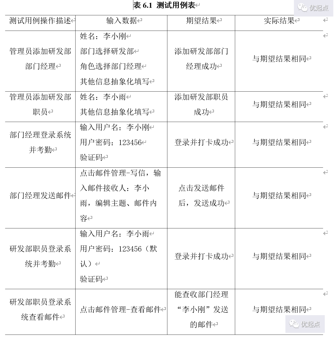 本节主要以表格的形式展示,写你的测试用例描述、输入数据、预期结果和实际结果,但是注意的是,要写核心功能的测试用例,一些登录、页面效果展示等的非核心功能,不要在这里写。