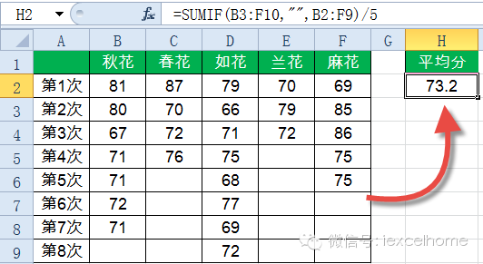 =SUMIF(B3:F10,””,B2:F9)/5