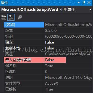 在运行前可能会出现错误提示:无法嵌入互操作类型"Microsoft.Office.Interop.Word.ApplicationClass".解决方法是:在Visual Studio 中点击菜单项"视图->解决方案资源管理器"在其中点开"引用"文件夹,在"Microsoft.Office.Interop.Word" 上点击鼠标右键选择"属性".将属性中的"嵌入互操作类型"的值改为"false"即可.如下图所示: