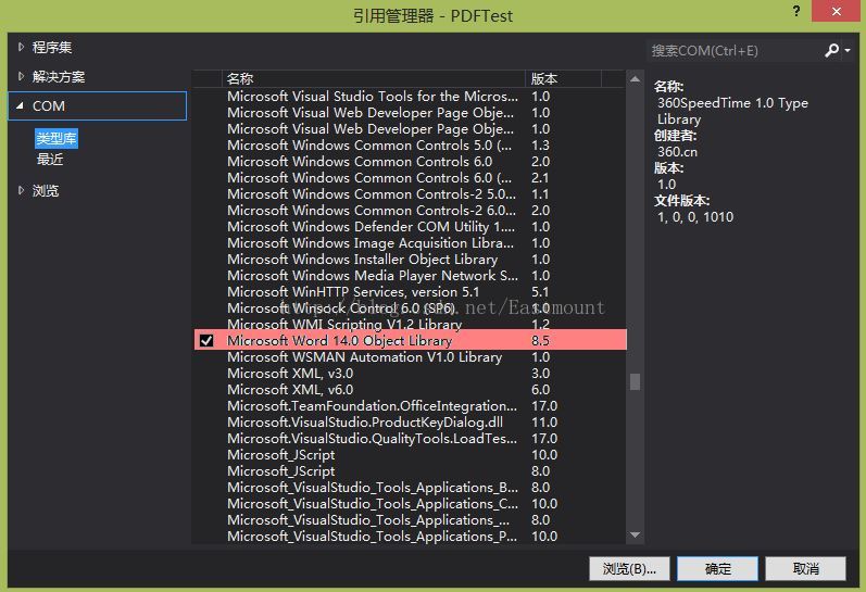 然后需要引用COM中的Miscrosoft Word 14.0 Object Library到工程中去.在"解决方案资源管理器"窗口中右击"引用"对象,在弹出的快捷菜单中选择"添加引用"命令,弹出"添加引用"对话框中选择COM选项卡,选择"Miscrosoft Word 14.0 Object Library".如下图所示:
