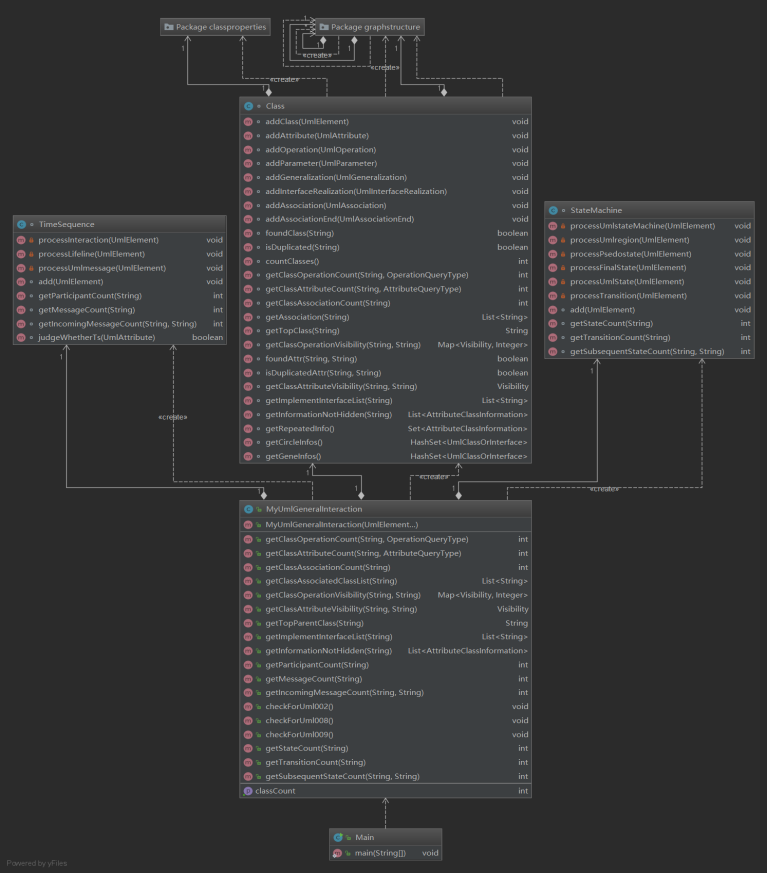Class类是管理以上5个类的一个界面,它向上与MyUmlInteraction相接,向下管理5个功能类。实际上信息分发和结果总结的一个类。