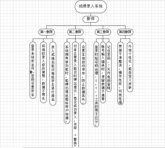 必要需求 | 第二象限 1.系统拥有新功能时,能弹出推送框给用户知道; 2.对非正常录入能及时弹出提示,若没成功录入,尽早 “警告”; 3.设置本地自动保存(类似博客园),防止数据丢失。 | 第一象限 1.登录系统安全可靠,密码设置安全; 2.成绩的录入修改简易,数据不易失; 3.录入成绩后能对每班学生进行排名, 学生查询时可看到自身的学习状态。 |