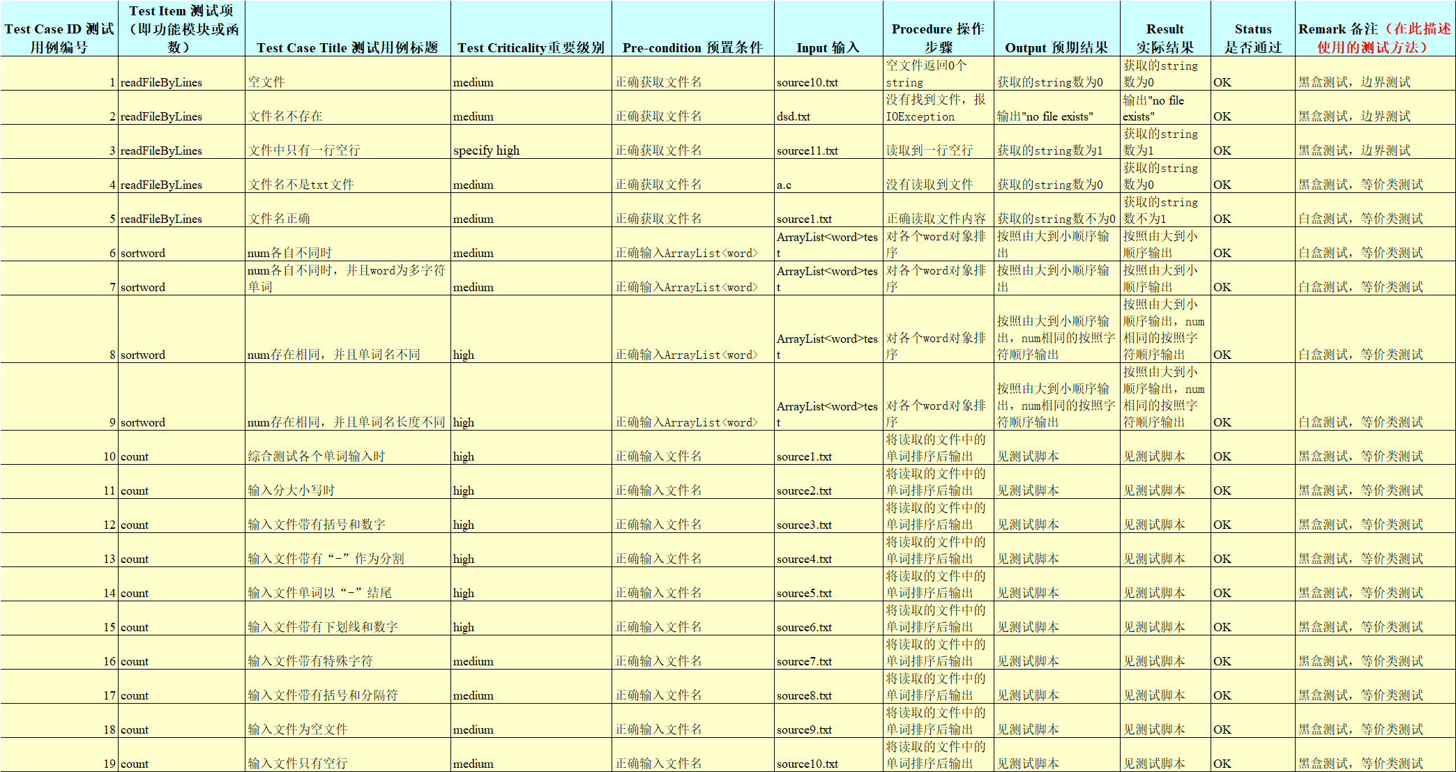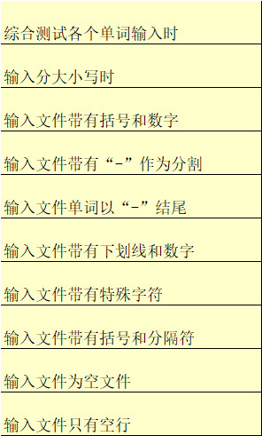 (3)对于组员写的单词识别和词频统计方法,采用黑盒测试的方法,根据功能需求,考虑了边界值条件,测试当内容为空,内容为带“-”,常见字符,数字等情况,并进行了等价类划分: