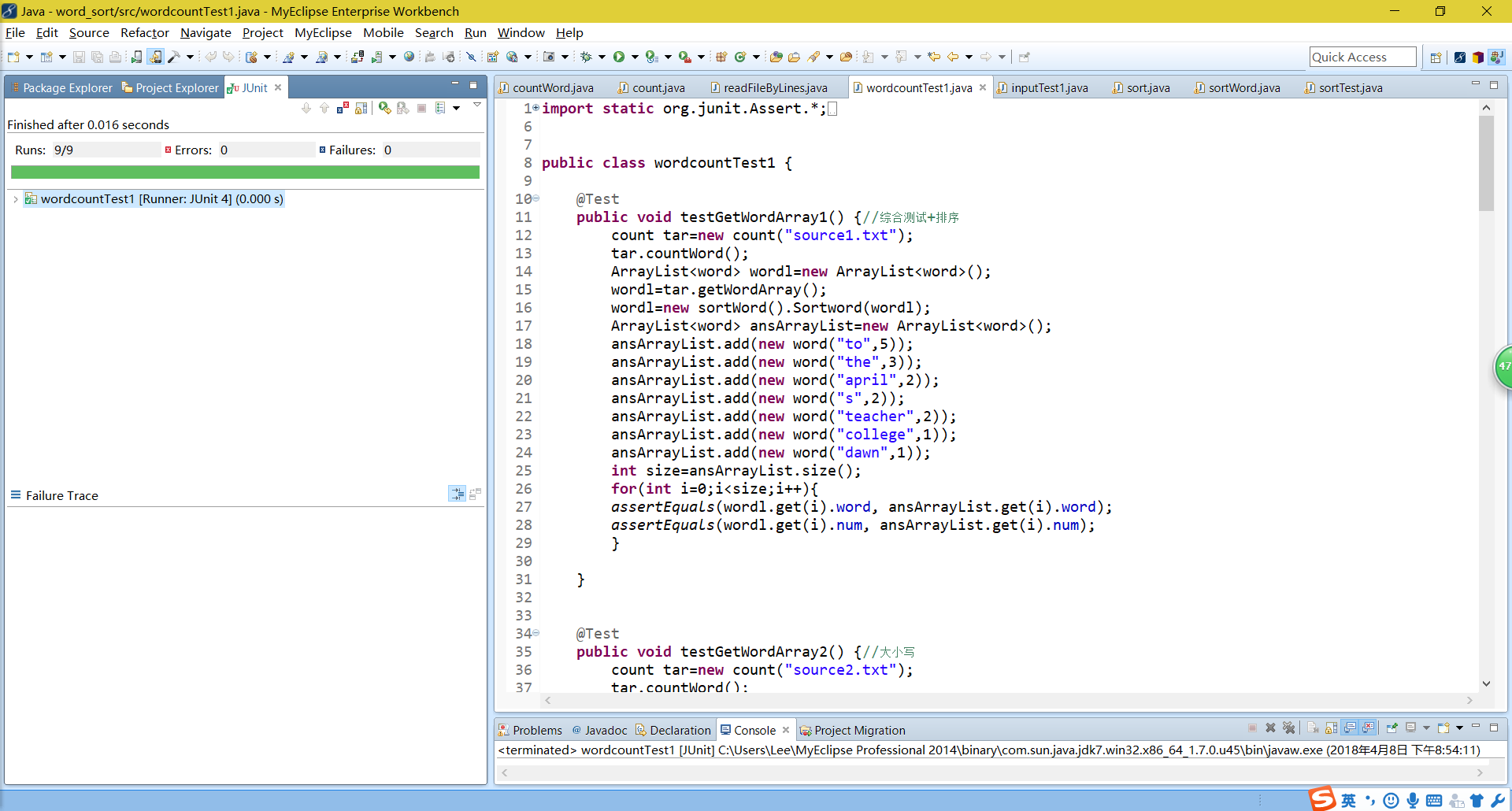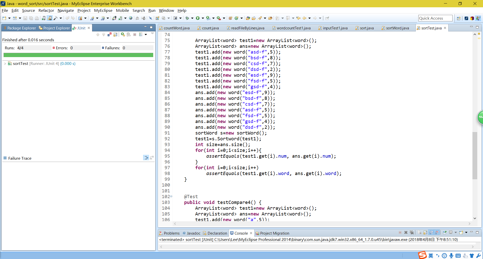 (1)对于我自身写的两个类,sort与sortWord类,前者是重载了comparator运算符,后者是进行排序,采用白盒测试方法,对不同的路径进行覆盖,需要对当不同的词频时,相同词频不同单词,相同词频不同单词长度的情况进行排序。