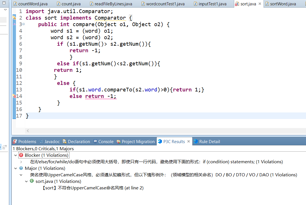 2)个人认为通过规范代码可以增强代码的可读性和可调试性,方便进行团队成员内部之间进行同行评审,命名规范可以使得各个变量一目了然,清晰地了解各个变量和类的作用,对于类,常用每个单独的单词首字母大写,其余小写,而普通变量则第一个单词首字母小写,其后的单词首字母大写,比如读文件的类ReadFileByLines,统计方法countWord。