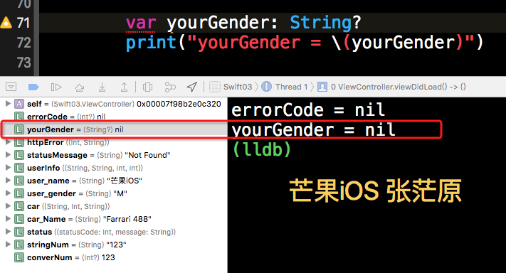 如果声明可选类型的变量没有赋值,他们被自动被设置为nil,我们定义了一个可选字符串类型变量yourGender没有给初始值,系统默认为nil。黄色的警告是提示变量yourGender值没有改变建议用常量,不用管这个警告: