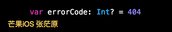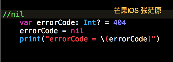 我们声明了一个Int类型的可选变量errorCode,包括了一个可选的值404。下边有把可选变量errorCode赋值为nil,表示没有值。
