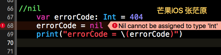 nil只能用于可选类型的变量或常量赋值,对于非可选类型的常量或者变量如果用了nil,编译器会报错: