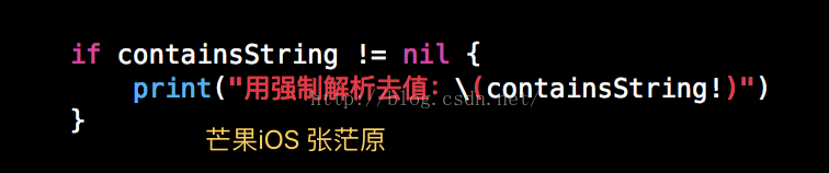 你可以使用if语句和nil比较来判断一个可选值是否包含值。可以使用“相等==”或“不等!=”来比较。我定义了一个可选字符串类型常量containsString,赋初值Mango-iOS。