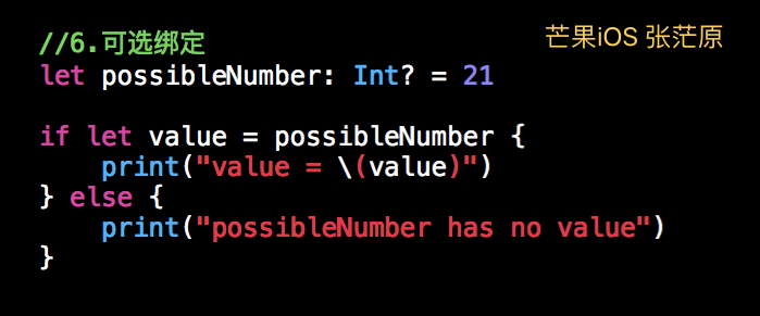 使用可选绑定(optional binding)来判断可选类型是否包含值,如果包含就把值赋给一个临时常量或者变量。可选绑定可以用在if和while语句中,这条语句不仅可以用来判断可选类型中是否有值,同时可以将可选类型中的值赋给一个常量或者变量。