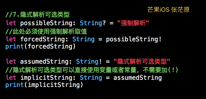 也可以把隐式解析可选类型当做一个可以自动解析的可选类型。要做的只是声明的时候把感叹号放到类型的后面。