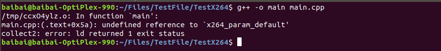 然后根据之前编译opencv的经验,有动态库时,需要将动态库链接进来,于是更换命令为:" g++ -o main main.cpp -lx264 "但仍旧出现相同的错误。