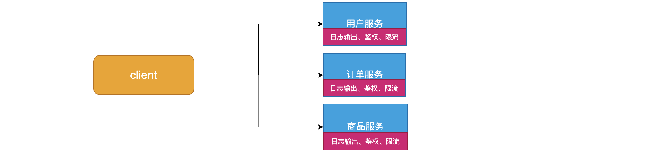 - 当我们有很多个服务时,比如下图中的user-service、order-service、product-service等服务,客户端请求各个服务的Api时,每个服务都需要做相同的事情,比如鉴权、限流、日志输出等。