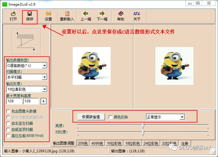 以上就是干净小鸭子最近收集整理的关于【工具】TFT彩屏图片点阵取模工具,Img2Lcd图片取模软件,图片生成c语言头文件...的全部内容,更多相关【工具】TFT彩屏图片点阵取模工具,Img2Lcd图片取模软件,图片生成c语言头文件内容请搜索靠谱客的其他文章。