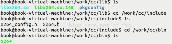 (4)make install安装之后在指定安装目录就有/bin,/include,/lib这三个文件夹,其中lib文件夹是动态链接库,/bin是可执行文件,拷贝到开发板的/lib,/bin目录就可以调用x264编码了。下图显示了/bin,/include,/lib这三个文件夹的内容。