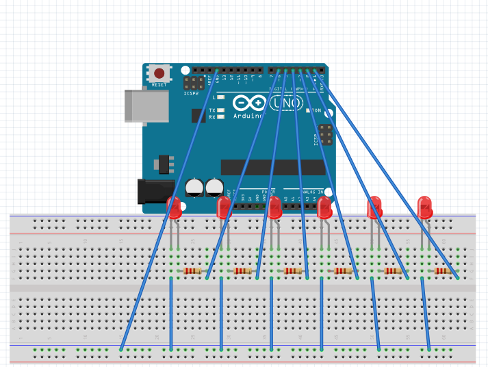 Ps:分别将led灯的长引脚通过导线连接上Arduino开发板的1-6号数字接口,将其余led引脚连接到GND地线上。