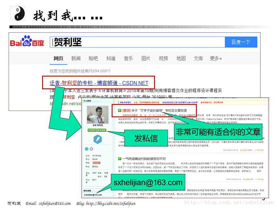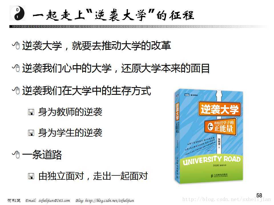 =================== 迂者 贺利坚 CSDN博客专栏================= |== IT学子成长指导专栏 专栏文章的分类目录(不定期更新) ==| |== C++ 课堂在线专栏 贺利坚课程教学链接(分课程年级) ==| |== 我写的书——《逆袭大学——传给IT学子的正能量》 ==| ===== 为IT菜鸟起飞铺跑道,和学生一起享受快乐和激情的大学 ===== |