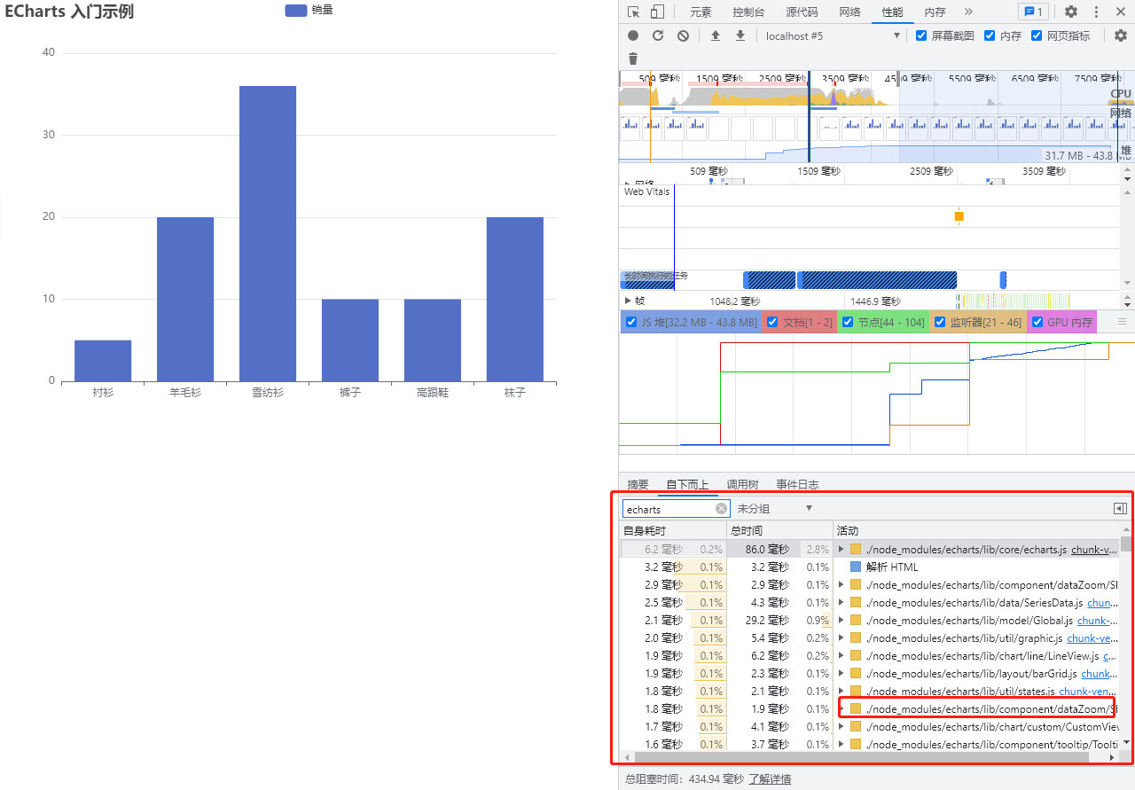 可以看出相同echarts图,全量引入花费时间 3009ms,按需引入花费1988ms,时间直接减少了三分之一。而且全量引入还会引入一些用不到的组件比如下图中的dataZoom就没在页面上用到,但浏览器还是将其加载了:
