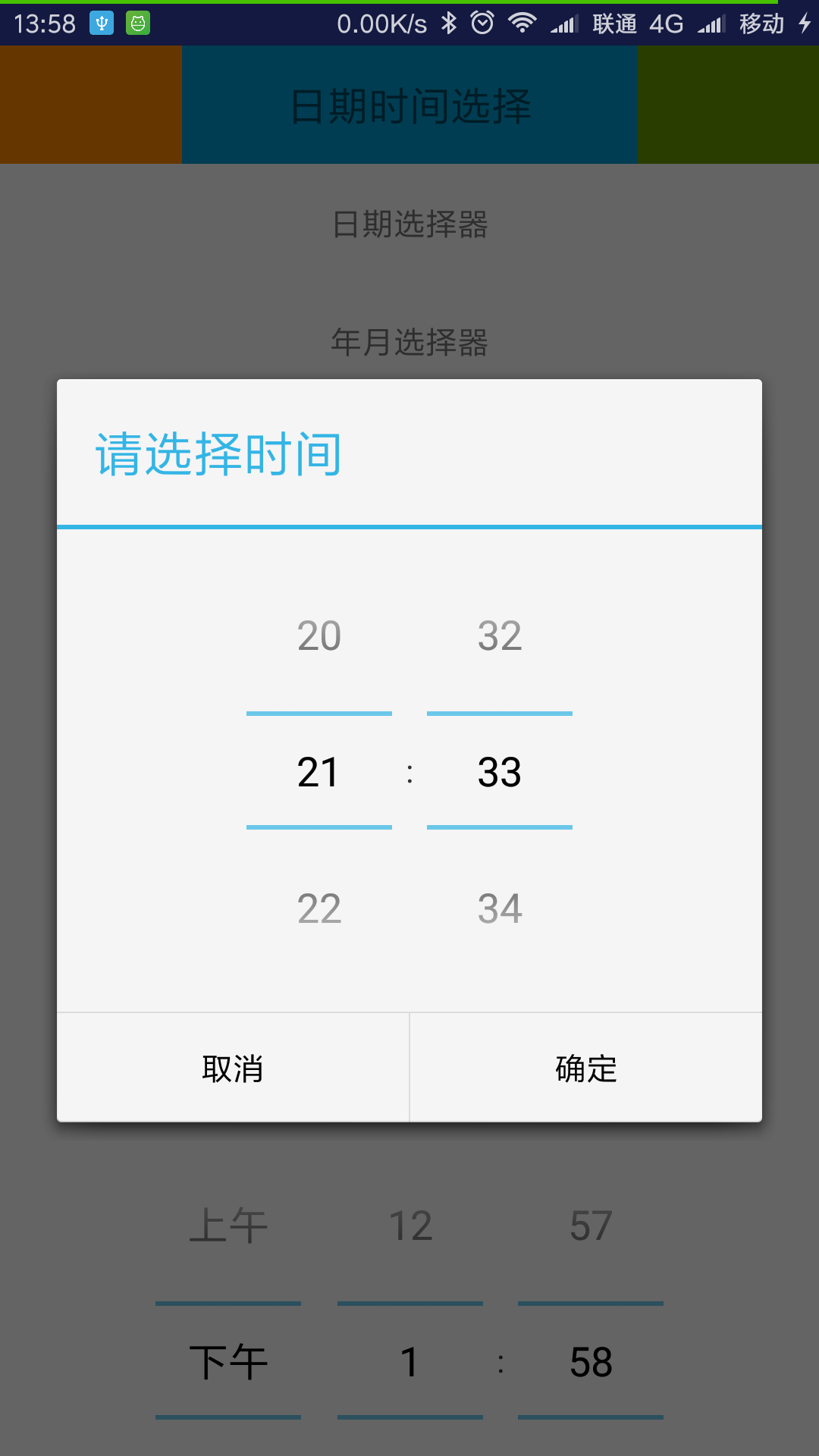BasisTimesUtils.showTimerPickerDialog(mActivity, true, "请选择时间", 21, 33, true, new BasisTimesUtils.OnTimerPickerListener() {