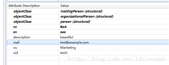 ⑤至此,我们可以在图形浏览工具Apache Directory Studio界面看到,已有产生的ou=Marketing的组织并且cn=BoA的数据中包含email属性字段: