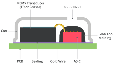 MEMS麦克风由放置在印刷电路板(PCB)上,并用机械盖保护的MEMS组件构成。其在外壳上制造了一个小孔,以允许声音进入麦克风,如果开孔在顶盖中,则指定为顶部端口;如果开孔在PCB中,则指定为底部端口。MEMS组件通常设计有机械隔膜和在半导体芯片上创建的安装结构。