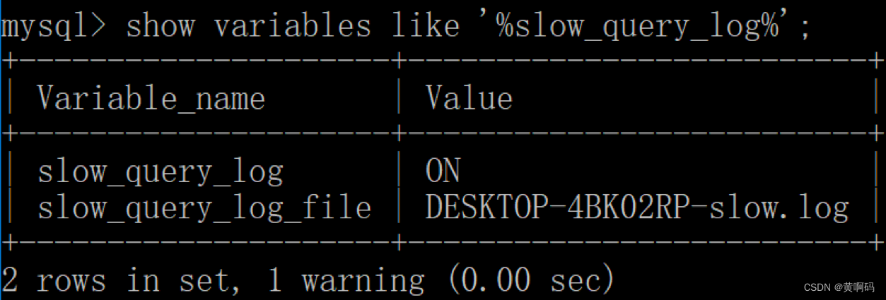 你能看到这时慢查询分析已经开启,同时文件保存在 DESKTOP-4BK02RP-slow 文件中。