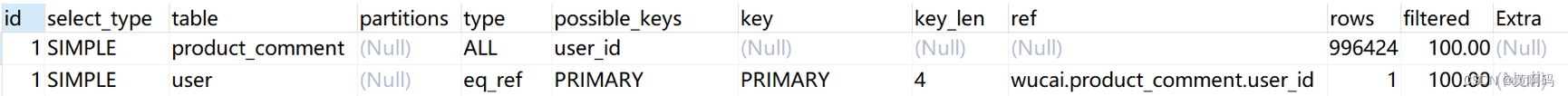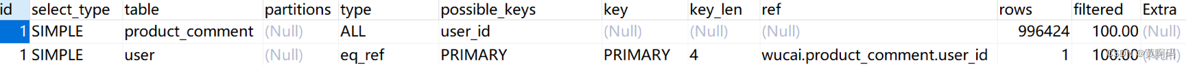 eq_ref 类型是使用主键或唯一索引时产生的访问方式,通常使用在多表联查中。假设我们对 product_comment 表和 usre 表进行联查,关联条件是两张表的 user_id 相等,使用 EXPLAIN 进行执行计划查看: