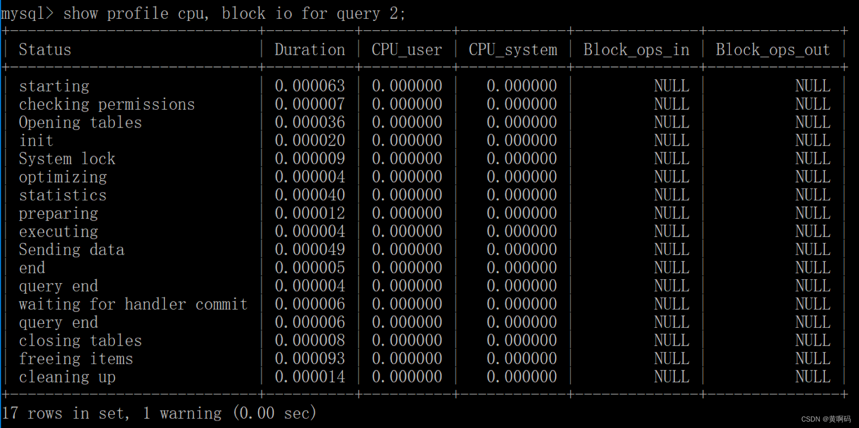 我们也可以查看指定的 Query ID 的开销,比如 show profile for query 2 查询结果是一样的。在 SHOW PROFILE 中我们可以查看不同部分的开销,比如 cpu、block.io 等: