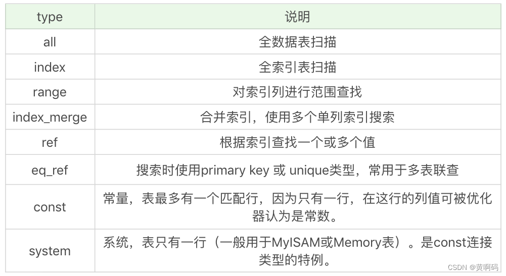 数据表的访问类型所对应的 type 列是我们比较关注的信息。type 可能有以下几种情况: