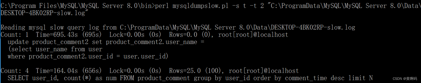 perl mysqldumpslow.pl -s t -t 2 "C:ProgramDataMySQLMySQL Server 8.0DataDESKTOP-4BK02RP-slow.log"