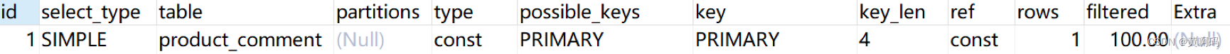 这里 user_id 为普通索引(因为 user_id 在商品评论表中可能是重复的),因此采用的访问类型是 ref,同时在 ref 列中显示 const,表示连接匹配条件是常量,用于索引列的查找。