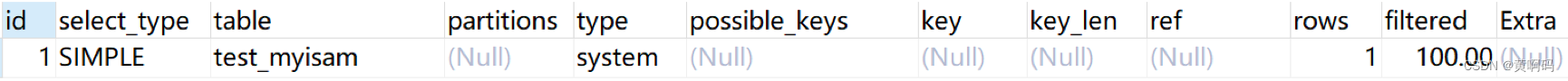 system 类型一般用于 MyISAM 或 Memory 表,属于 const 类型的特例,当表只有一行时连接类型为 system(我在 GitHub 上上传了 test_myisam 数据表,该数据表只有一行记录,