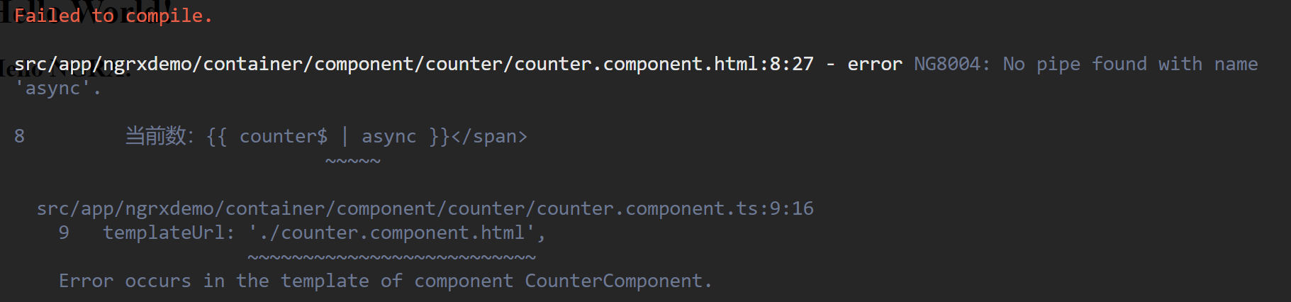 src/app/ngrxdemo/container/component/counter/counter.component.html:8:27 - error NG8004: No pipe found with name ‘async’.