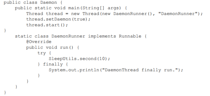 Daemon线程是一种支持型线程,因为它主要被用作程序中后台调度以及支持性工作。这意味着,当一个Java虚拟机中不存在非Daemon线程的时候,Java虚拟机将会退出。可以通过调用Thread.setDaemon(true)将线程设置为Daemon线程。注意Daemon属性需要在启动线程之前设置,不能在启动线程之后设置。