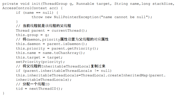 在运行线程之前首先要构造一个线程对象,线程对象在构造的时候需要提供线程所需要的属性,如线程所属的线程组、线程优先级、是否是Daemon线程等信息。