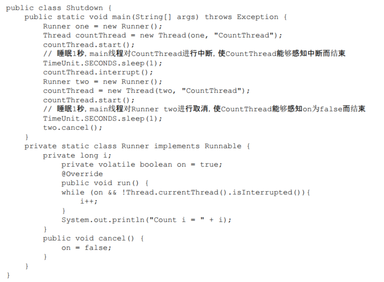 main线程通过中断操作和cancel()方法均可使CountThread得以终止。这种通过标识位或者中断操作的方式能够使线程在终止时有机会去清理资源,而不是武断地将线程停止,因此这种终止线程的做法显得更加安全和优雅。