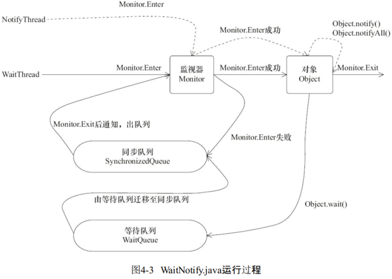 从图4-2中可以看到,任意线程对Object(Object由synchronized保护)的访问,首先要获得Object的监视器。如果获取失败,线程进入同步队列,线程状态变为BLOCKED。当访问Object的前驱(获得了锁的线程)释放了锁,则该释放操作唤醒阻塞在同步队列中的线程,使其重新尝试对监视器的获取。