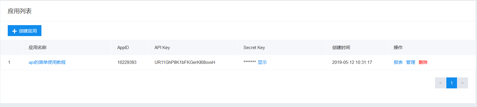 首先需要进入百度ai的官网http://ai.baidu.com/?track=cp:aipinzhuan|pf:pc|pp:AIpingtai|pu:title|ci:|kw:10005792,选择你想要的产品功能(现在笔者以情感倾向分析来创建应用实例),然后创建一个应用,得到其中的key和secret,如下图所示。