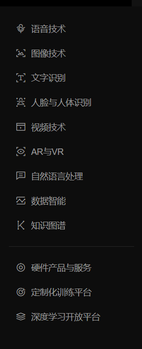 百度ai的api有很多种类,如下图所示。大家可以选择自己想使用的应用来学习他的api文档。