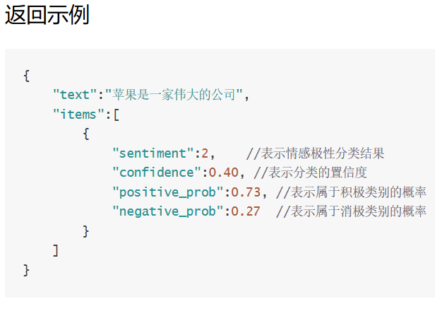 以‘苹果是一家伟大的公司‘为例,将会得到如下所示的返回结果: