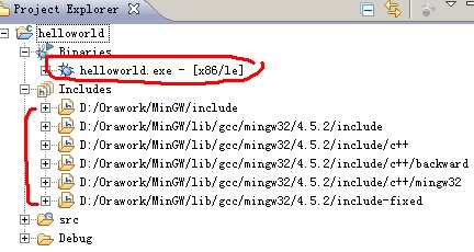 2)启动eclipse创建一个helloworld小程序测试,includes是自动加入的,可以看到把安装mingw文件夹内该导入的都导入了,保证c与cpp头文件、lib文件都能用了。build一下出现helloworld.exe说明编译、连接完成。环境配置完成,如果说出现某某文件未找到,build is stopped,是因为mingw没有装完整,放心官网的肯定完整。(注:环境变量这一块只有/mingw/bin 这一项,有网站说要加入许多变量,各种名,基本就是把eclipse自动include的路径都放到系统环境变量里面。但是我没有加即成功了,对其他网站是否正确表示怀疑。可探讨)。