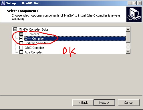 这个下载器可以下载各种编译环境(c、cpp、java等),咱们只需要下载c和c++的编译器即可了,注意选项勾选c与c++,至于mysys是在windows下模拟linux环境,如使用cd、ls等命令,个人觉得没必要下载。可以搜索mysys相关用法。