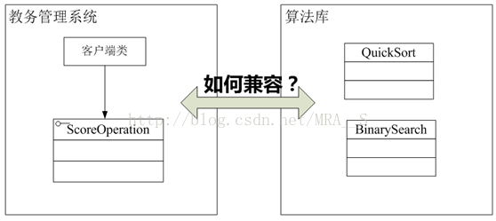 通过分析,我们不难得知,现在Sunny软件公司面对的问题有点类似本章最开始所提到的电压问题,成绩操作接口ScoreOperation好比只支持20V电压的笔记本,而算法库好比220V的家庭用电,这两部分都没有办法再进行修改,而且它们原本是两个完全不相关的结构,如图9-2所示: