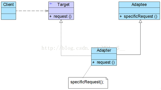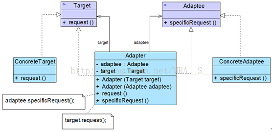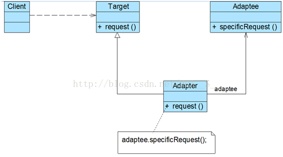● Adapter(适配器类):适配器可以调用另一个接口,作为一个转换器,对Adaptee和Target进行适配,适配器类是适配器模式的核心,在对象适配器中,它通过继承Target并关联一个Adaptee对象使二者产生联系。