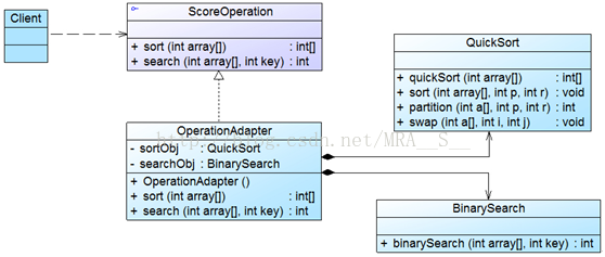 Sunny软件公司在很久以前曾开发了一个算法库,里面包含了一些常用的算法,例如排序算法和查找算法,在进行各类软件开发时经常需要重用该算法库中的算法。在为某学校开发教务管理系统时,开发人员发现需要对学生成绩进行排序和查找,该系统的设计人员已经开发了一个成绩操作接口ScoreOperation,在该接口中声明了排序方法sort(int[]) 和查找方法search(int[], int),为了提高排序和查找的效率,开发人员决定重用算法库中的快速排序算法类QuickSort和二分查找算法类BinarySearch,其中QuickSort的quickSort(int[])方法实现了快速排序,BinarySearch 的binarySearch (int[], int)方法实现了二分查找。