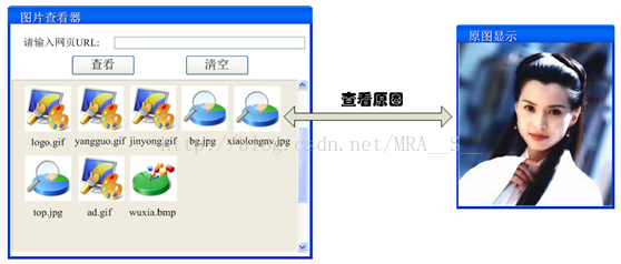 某软件公司欲开发一款基于C/S的网络图片查看器,具体功能描述如下:用户只需在图片查看器中输入网页URL,程序将自动将该网页所有图片下载到本地,考虑到有些网页图片比较多,而且某些图片文件比较大,因此将先以图标的方式显示图片,不同类型的图片使用不同的图标,并且在图标下面标注该图片的文件名,用户单击图标后可查看真正的图片,界面效果如图15-7所示。试使用虚拟代理模式设计并实现该图片查看器。(注:可以结合多线程机制,使用一个线程显示小图标,同时启动另一个线程在后台加载原图。)