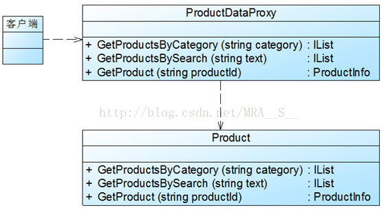 与业务逻辑层Product对象的GetProductsByCategory()方法相比,上述代码增加了缓存机制。当缓存内不存在相关数据项时,则直接调用业务逻辑层Product的GetProductsByCategory()方法来获取数据,并将其与对应的AggregateCacheDependency对象一起存储在缓存中。在ProductDataProxy类的每一个业务方法中都实例化了Product类,再调用Product类的相应方法,因此ProductDataProxy与Product之间属于依赖关系,这是标准代理模式的一种变形,可以按照标准代理模式对其进行改进,包括引入高层的抽象接口。